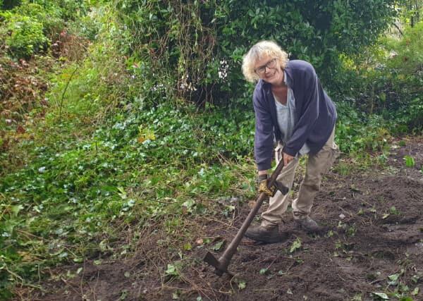 The first problem was to find a place large enough to create a work area and locate some compost bins. Many areas were explored until a space, hidden in a wilderness of ivy, blackberries and neglect, was identified on public land in April. Undaunted by the clearing ahead, the GoLlies added this space to its maintenance portfolio, and starting on April 21st several weeks were spent preparing the site, by weed removal and levelling.