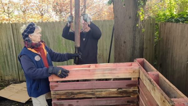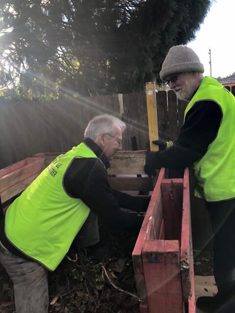 The next challenge was to build the compost bins themselves. Many ideas were tossed around for bin construction, and from this emerged the use of recycled pallets. Six were donated by Colless Foods, and research confirmed that these were made of untreated timber, and so ideal. Calling upon the building "skills" of its team, a plan evolved, and the first bin was completed on June 2nd. It was determined to be effective and "rustic", but perhaps a little short of master builder quality.
