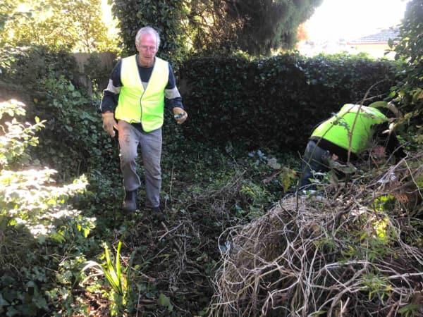 The first problem was to find a place large enough to create a work area and locate some compost bins. Many areas were explored until a space, hidden in a wilderness of ivy, blackberries and neglect, was identified on public land in April. Undaunted by the clearing ahead, the GoLlies added this space to its maintenance portfolio, and starting on April 21st several weeks were spent preparing the site, by weed removal and levelling.